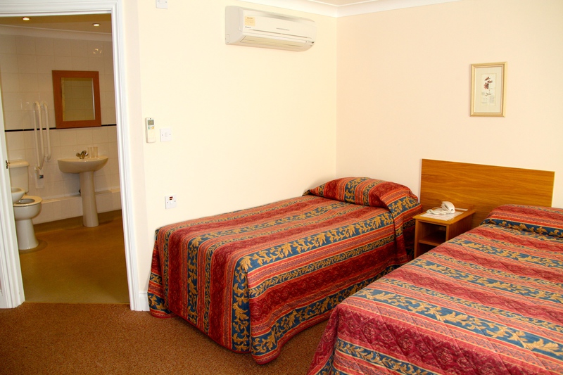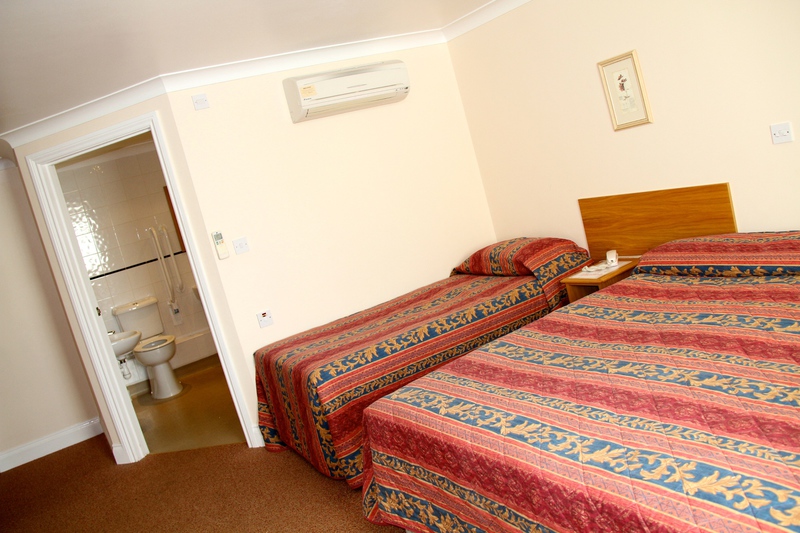 • Our disabled friendly room is located on the first floor right outside the lift which makes this room the most accessible room. The room has a wider door of 7900mm. When entering the room it has a short pile carpet with a zip and link bed on the back facing wall, left as you look at the bed the gap from wall to bed is 1500mm and to the right side wall to bed gap is 870mm. The room is decorated in neutral colours and has a main ceiling light and spots to highlight main areas of the room. All rooms are ensuite and have a telephone, television with built in Freeview and free Wi-Fi. The room has build in a wardrobe and desk and chair area.