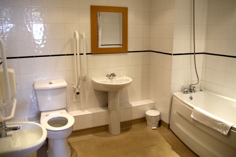 • All our rooms at The Old Hall Hotel are ensuite with a bath and a shower over the bath. Our disabled friendly room has a lower sink at the height of 700mm from the floor. Also around the toilet which seat is 470mm from the floor is full hand rails for assistance. This room also has a shower over the bath with a small tiled area at the end of the bath with a rail for support to help gain access to the bath and shower. The bathroom is tiled from floor to ceiling with spot lights in the ceiling making the bathroom very well lit. The flooring in the bathroom is a non slip safety flooring.